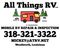 All Things RV is a MOBILE RV Repair and Inspection Business in Woodworth, Louisiana. Feel free to contact us; we will happily schedule an appointment to come to you. Allow us to help you with your RV! Please leave your contact information below or give us a call.